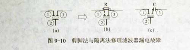 3、隔離法。當(dāng)濾波器輸入、輸出二端之間電時(shí)可以在一端串入一個(gè)幾十皮法的瓷片電容器C,這樣既能克服漏電故障,又能繼續(xù)利用它的濾波特性,如圖9—1 0(c)所示。