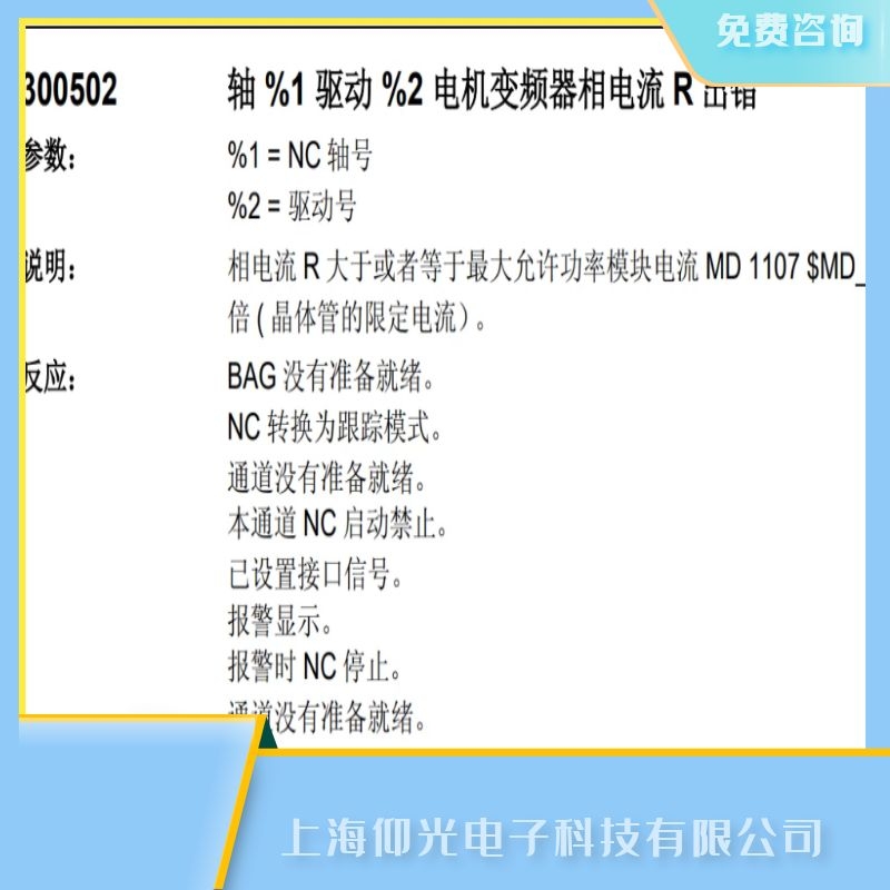 上海仰光電子科技有限公司維修面向全國,提供免費(fèi)檢測,免費(fèi)咨詢,有測試平臺,同一故障六個月質(zhì)保,修不好不收費(fèi)用,如有任何故障可隨時聯(lián)系我們,工程部溫馨提示:如果設(shè)備出現(xiàn)報(bào)警或者損壞,不是專業(yè)技術(shù)人員請勿私自拆卸,以防帶來安全隱患以及給設(shè)備造成二次傷害.上海仰光電子-您身邊的設(shè)備維修維護(hù)專員.關(guān)于常州西門子SIEMENS840c數(shù)控系統(tǒng)維修,西門子報(bào)300502故障報(bào)警代碼維修的技術(shù)問題上海仰光電子提供24小時免費(fèi)咨詢服務(wù).